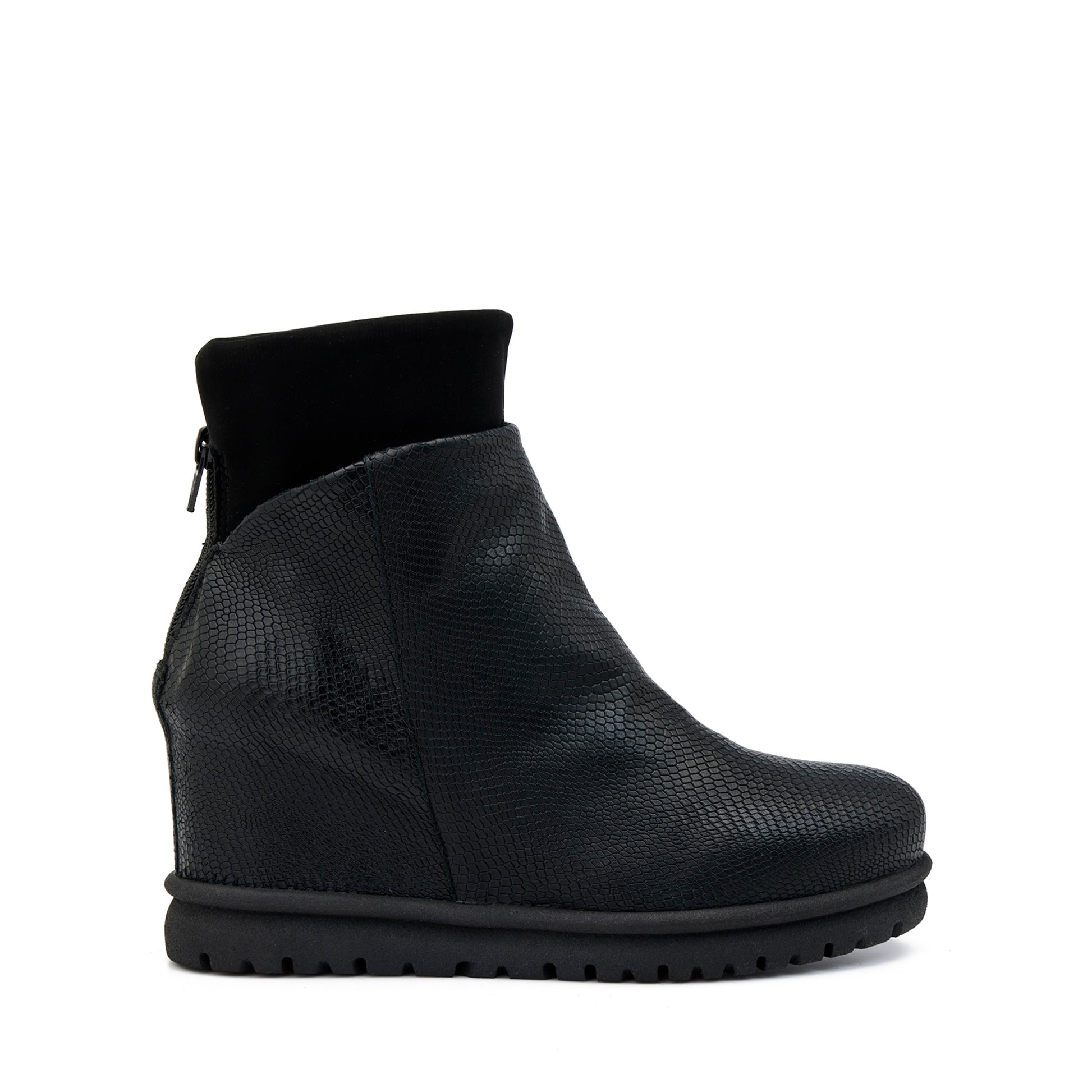 Tronchetto in pelle con calzino in tessuto elasticizzato, zip dietro, suola ronnie black/antracite, altezza tacco 80, platform 25, battuta 55, punta rotonda, zeppa interna, interno pelle, suola dentellata
