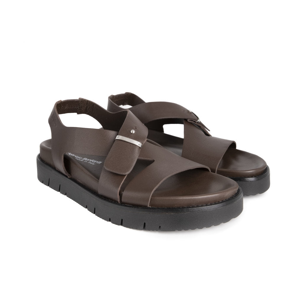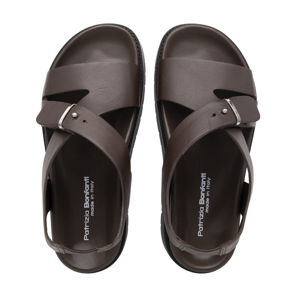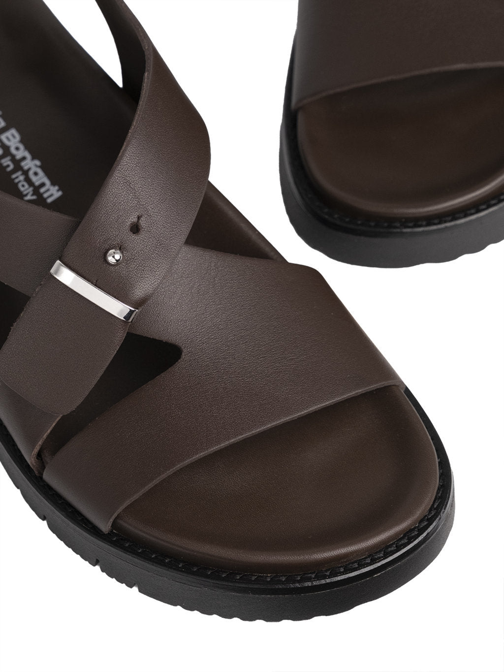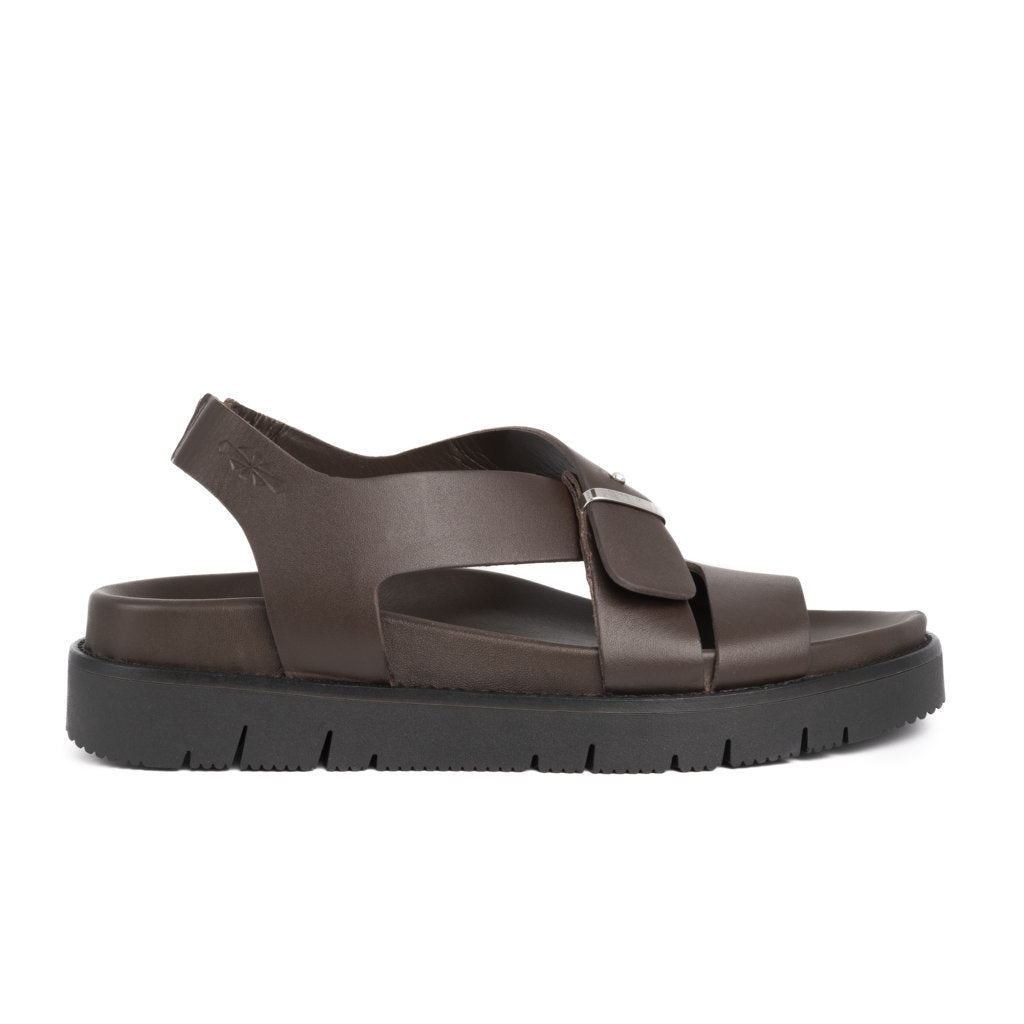 Baky sandals are the perfect lightweight shoe for hot summer days. They feature a woven strap that wraps around the foot naturally. The chocolate brown leather Baky sandals feature an elastic band for added comfort and a large buckle that allows the wearer to enjoy both practicality and a bright, chic look.
