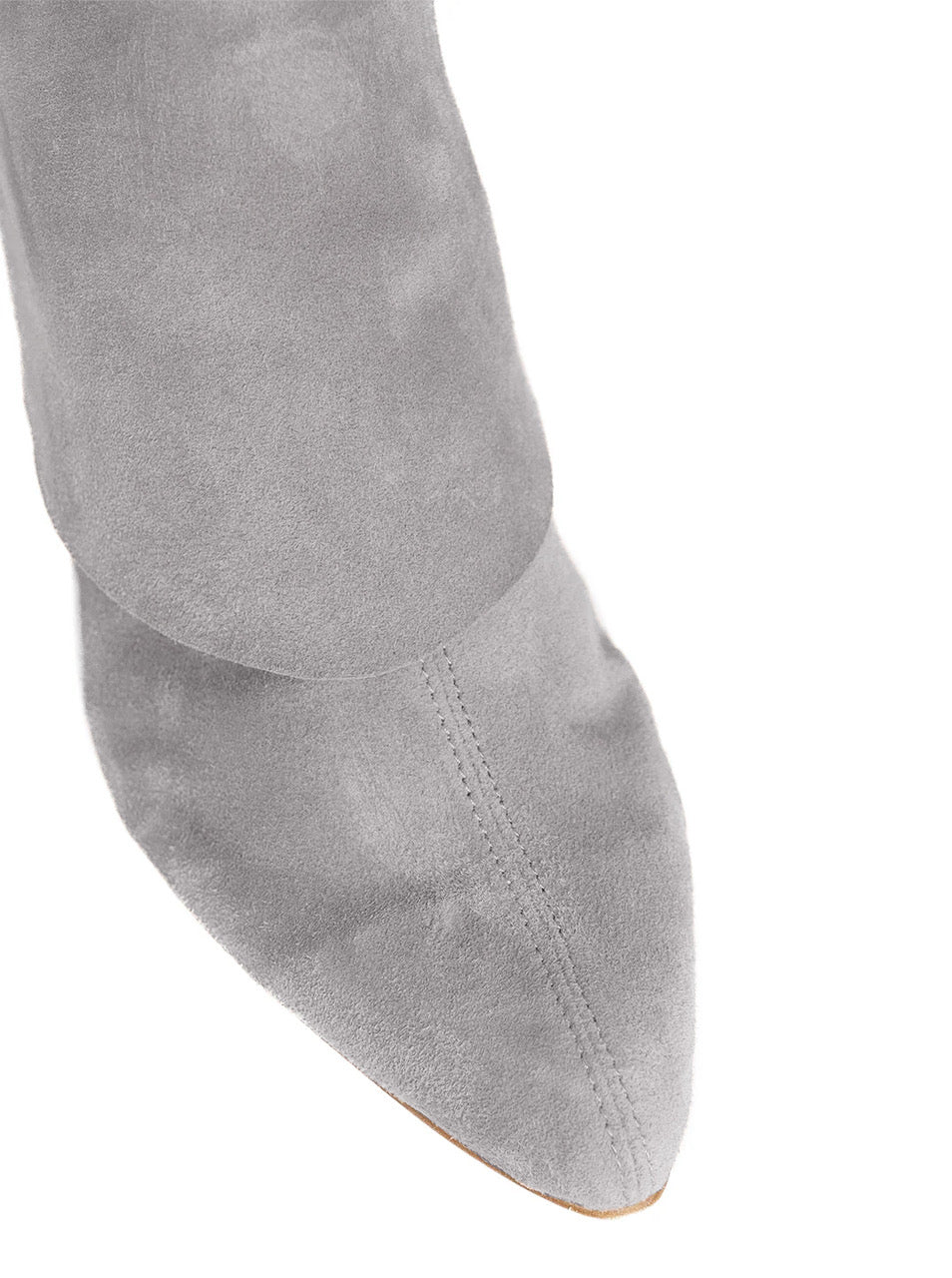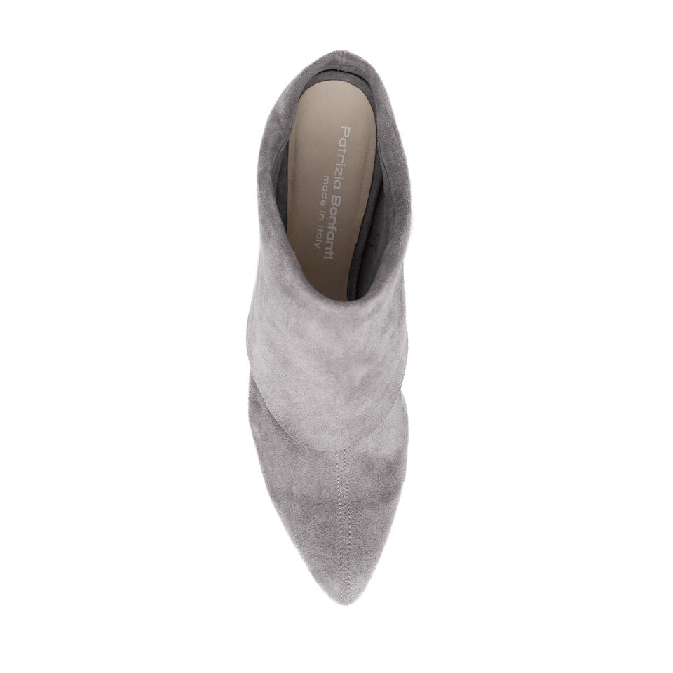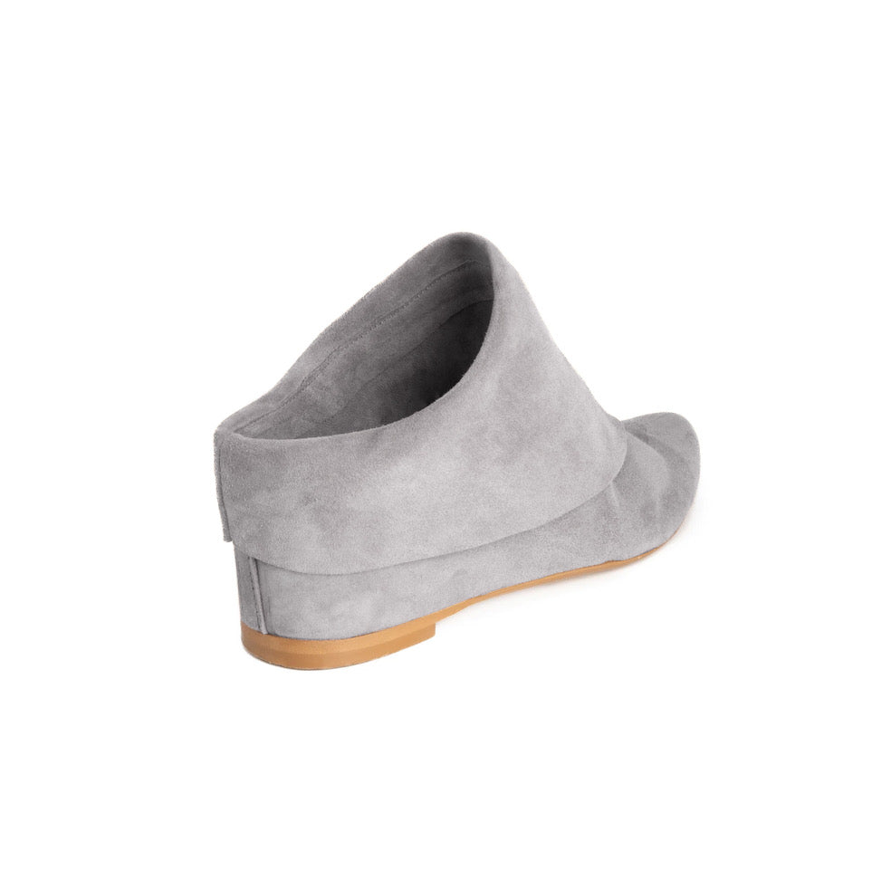 A perfect balance between contemporary design and tailored comfort. This ankle boot is crafted from soft grey suede, shaped to naturally wrap the foot and create subtle folds that enhance the material’s texture, making each pair unique.